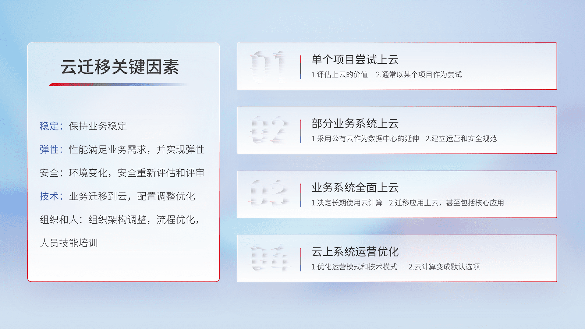 结合实际业务,,,从规划设计、、云平台选型、、、云原生改造、、数据迁移、、集成交付,,迁移全过程为客户识别最佳上云路径,,做好风险识别管理,,,设计网络架构、、、身份权限、、、、安全审计合规、、、、操作审计、、、、日志审计、、、监控告警策略、、、、多站点容灾设计等,,,对云上基础设施进行整体规划,,,,提升IT治理水平,,以满足弹性、、、高可用、、、、高性能的需求。。。。