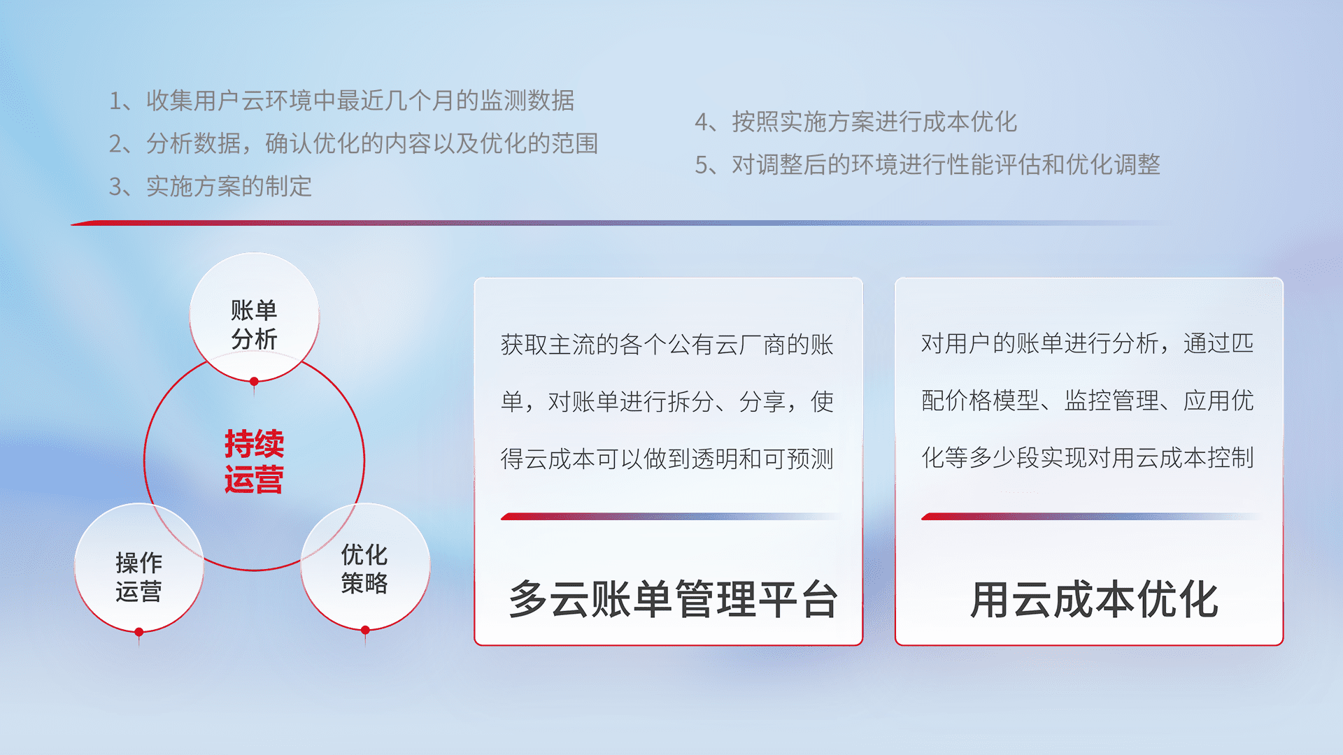 通过多云纳管,,,,以统一的资源数据模型把客户的云资源进行抽象和封装,,,进而实现对多云资源的统一操作,,,保障云资源管理的可靠性、、稳定性与可用性。。。。量身定制化运维内容,,,,配置、、、、开发运维、、、、补丁管理、、备份、、监控、、认证和访问管理、、、、审计和日常巡检等,,,,保障在用云过程中的可靠度,,稳定度以及高可用率。。。